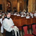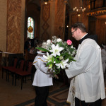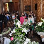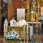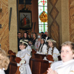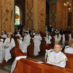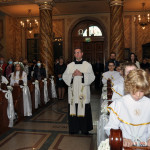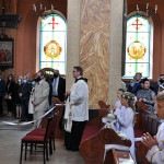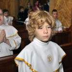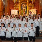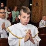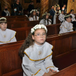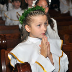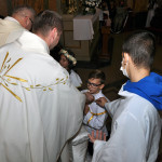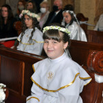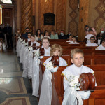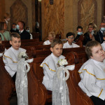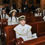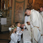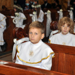 Przed rozpoczęciem Mszy świętej proboszcz naszej parafii Ojciec Sebastian Tracz przywitał wszystkich przybyłych na uroczystość, a szczególnie dzieci przystępujące do Pierwszej Komunii Świętej. Przedstawiciele rodziców dzieci pierwszokomunijnych zwrócili się z prośbą do Ojca Proboszcza o udzielenie Sakramentu Komunii Świętej. W koncelebrze uczestniczył o. Roman Janusz, homilię wygłosił proboszcz parafii. W czasie uroczystości dzieci złożyły podziękowania wręczając kwiaty Ojcu Proboszczowi , Ojcu Piotrowi Wojnowskiemu – katechecie i o. Romanowi, Dyrekcji szkół i nauczycielom . W pierwszej kolejności słowa wdzięczności i obietnica uczestnictwa w coniedzielnej Mszy świętej zostały skierowane przez dzieci do najważniejszej Osoby – Pana Jezusa, który w tym szczególnym dniu przyszedł do ich serc po raz pierwszy. Doniosły charakter tego wydarzenia podkreślił występ parafialnej Scholki Antolka.