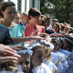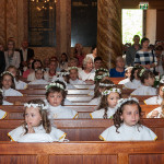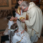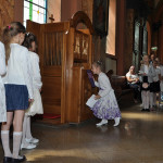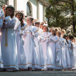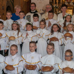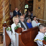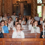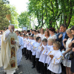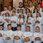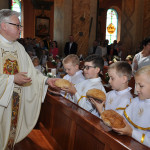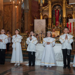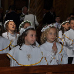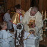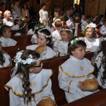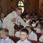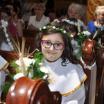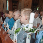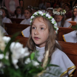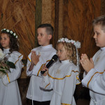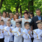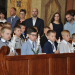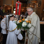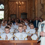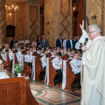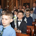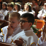Warto pamiętać, że Pierwsza Komunia Święta jest wyjątkowym dniem zarówno dla dzieci przyjmujących pod postacią chleba po raz pierwszy Pana Jezusa do swojego serca, jak również dla ich rodziców , jest wielkim świętem chrześcijańskich rodzin. Zawsze tak było w naszej polskiej tradycji, która od tysiąca lat ukształtowała się na tej ziemi jako tradycja chrześcijańska. Rodzina zawsze była i nadal pozostaje tym ludzkim środowiskiem, pierwszym i podstawowym, do którego Bóg przychodzi przez wielkie sakramenty naszej wiary, poczynając od chrztu świętego. Chrzest święty, jest fundamentem życia każdego chrześcijanina. Przed rozpoczęciem Mszy świętej proboszcz Ojciec Radosław Kramarski powitał zgromadzonych przed głównym wejściem do kościoła, a dzieci otrzymały błogosławieństwo rodziców. Po procesyjnym wejściu do świątyni i rozpoczęciu Mszy świętej przedstawiciele rodziców dzieci pierwszokomunijnych zwrócili się z prośbą do ojca Proboszcza o udzielenie sakramentu Eucharystii. Podczas liturgii słowa nastąpiło odnowienie przyrzeczeń chrzcielnych, a następnie odbyła się procesja z darami. Kulminacyjnym momentem uroczystości była Komunia Święta, po niej dzieci złożyły podziękowania rodzicom, rodzicom chrzestnym, Ojcu Proboszczowi oraz Ojcu Piotrowi Wojnowskiemu – katechecie, Dyrekcji, nauczycielom oraz wręczyły im kwiaty. Jednak w pierwszej kolejności słowa wdzięczności i obietnica uczestnictwa w coniedzielnej Eucharystii zostały skierowane ze strony dzieci do najważniejszej Osoby – Pana Jezusa, który w tym szczególnym dniu przyszedł do ich serc po raz pierwszy.
