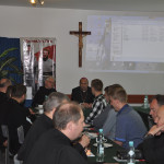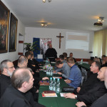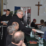 W dniu 5 maja 2018 odbyło się pierwsze w dziejach diecezji sosnowieckiej spotkanie Osób Życia Konsekrowanego Zakonów i Zgromadzeń Męskich. Spotkanie miało charakter formacyjny, modlitewny i wspólnotowy. Spotkanie zostało zainicjowane przez O. Radosława Kramarskiego OFMConv – Wikariusza Biskupiego ds Zakonów w Diecezji Sosnowieckiej. Spotkanie rozpoczęło się konferencją, którą wygłosił Ks. dr Michał Borda – Dyrektor Wydziału Katechetycznego Diecezji Sosnowieckiej. Temat konferencji brzmiał „ Podpowiedzi Papieża Franciszka w aspekcie wychowania” . W oparciu o dokumenty papieskie takie jak: „ Amoris Laetitia” oraz „ Evangelii gaudium” Prelegent wskazał na cztery filary wychowania: rodzina, modlitwa, katecheza, opowiadania biblijne i liturgia. Wspomniane elementy składają się na cały proces wychowawczy człowieka i kształtuje jego osobowość, charakter i wrażliwość na Boga i człowieka. W czasie spotkania nie brakowało czasu na podzielenie się również tym czym żyje kościół w Polsce i naszej diecezji. Na spotkaniu swoją obecnością zaszczycił nas Ks Bp dr Grzegorz Kaszak – Ordynariusz Diecezji Sosnowieckiej, który w swoim „słowie” zachęcił wszystkich do dzielenia się swoimi charyzmatami na terenie diecezji sosnowieckiej, podkreślał wielkie zaangażowanie zakonów i zgromadzeń w tworzeniu i ubogacaniu kościoła lokalnego jakim jest diecezja. Zwrócił uwagę na budzenie w naszych wspólnotach „ducha misyjnego”, aby poprzez działalność duszpasterską rozbudzać w wiernych potrzebę zaangażowania się na rzecz misji i misjonarzy. Po wystąpieniu Księdza Biskupa zostając w atmosferze misyjnej Ojcowie Franciszkanie przedstawili postacie dwóch Błogosławionych Męczenników z Peru O. Michała Tomaszka i O. Zbigniewa Strzałkowskiego. O. Piotr Wojnowski OFMConv z Dąbrowy Górniczej przedstawił swoje osobiste świadectwo związane z Bł. O. Michałem Tomaszkiem, który przygotowywał Go do Pierwszej Komunii Świętej. Wspomniał, że nigdy nie myślał o tym że będzie się modlił do swojego „ Błogosławionego Katechety”. Nasze spotkanie zakończyła modlitwa brewiarzowa „ … w ciągu dnia – południowa” . Po modlitwie wspólny obiad i zakończenie spotkania. Jak Wszyscy uczestnicy spotkania podkreślali takich spotkań nam potrzeba. W diecezji sosnowieckiej jest obecnych dziesięć wspólnot zakonnych. Każda wspólnota była reprezentowana w całości lub w części.