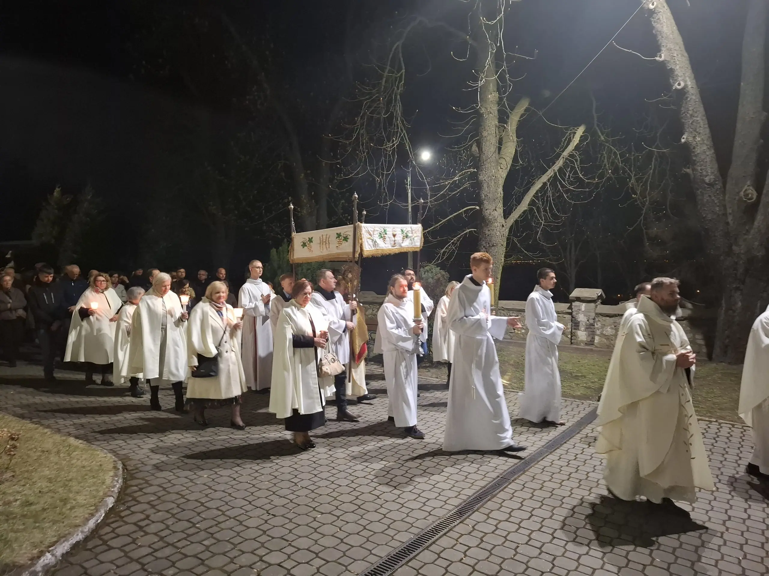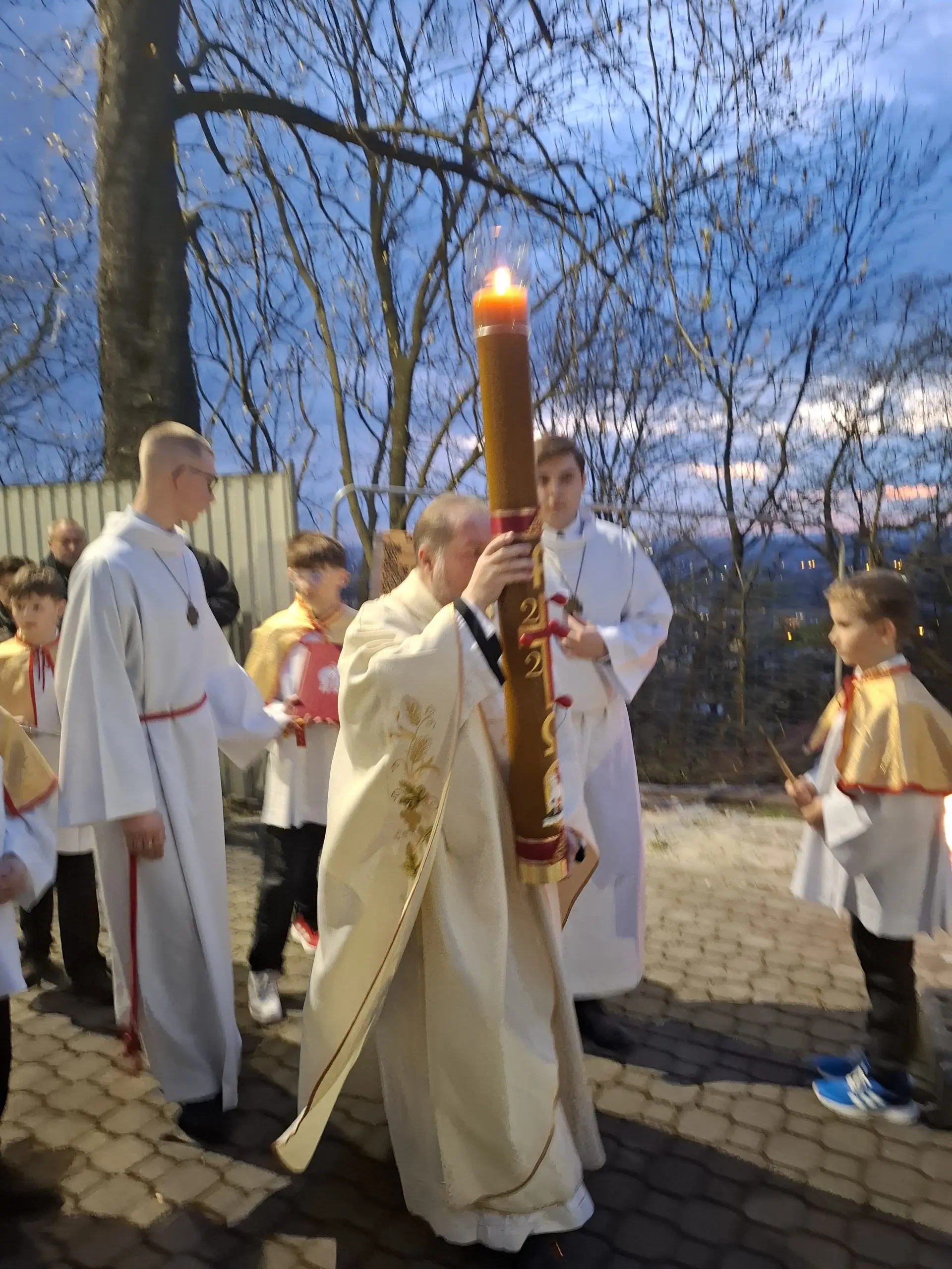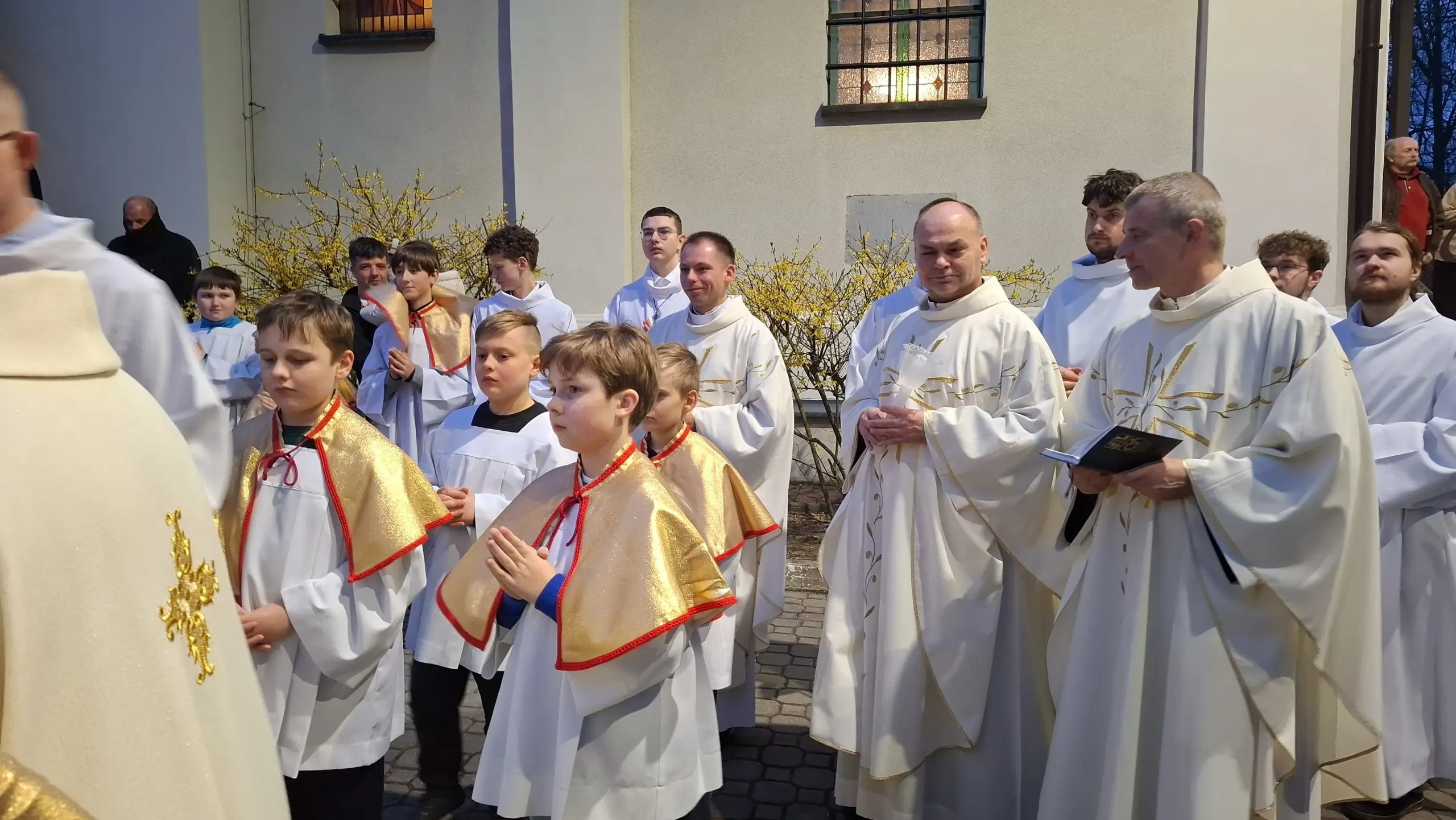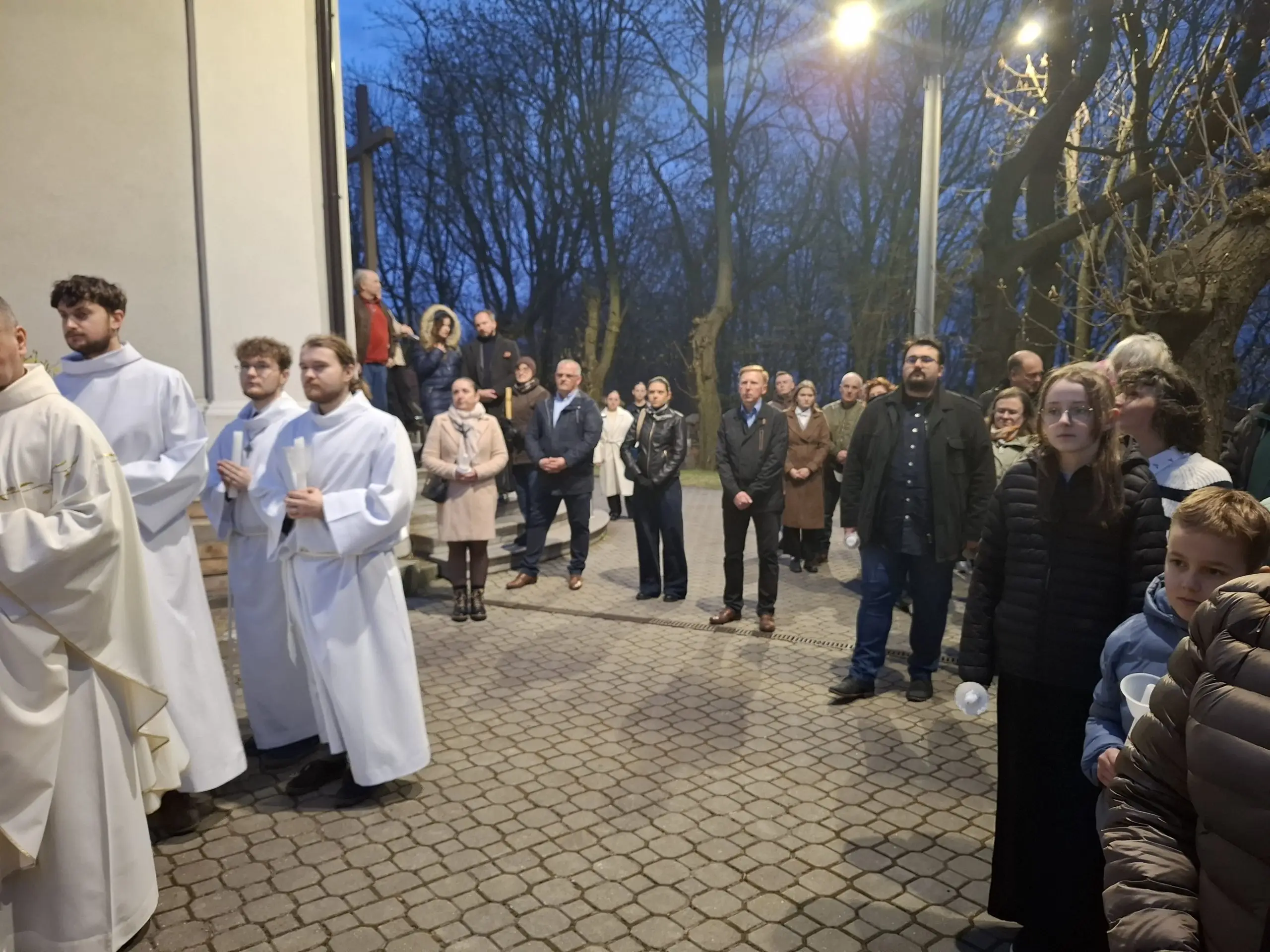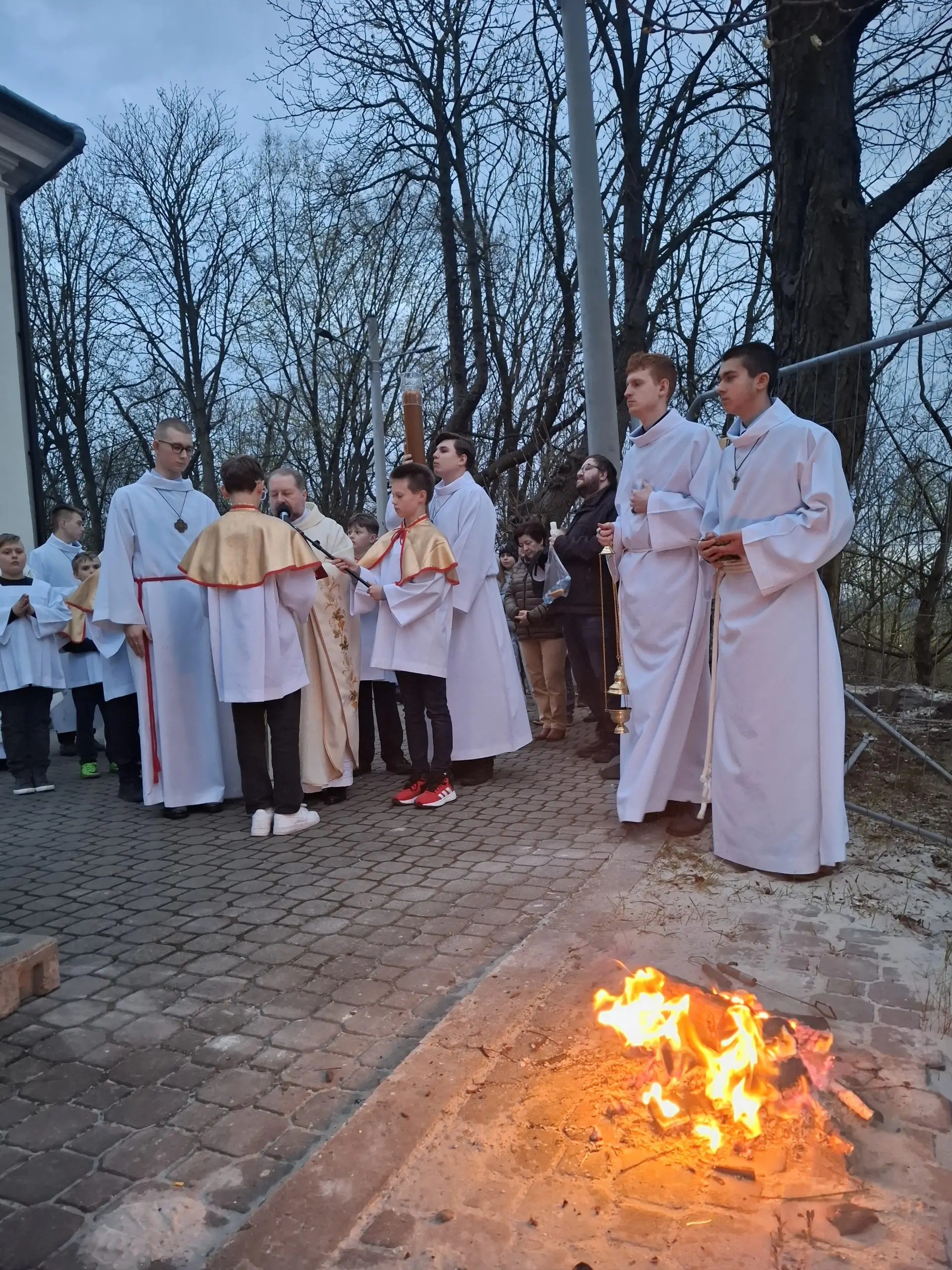 Odnawiamy przyrzeczenia chrzcielne. Od ognia rozpalonego i poświęconego przed kościołem, kapłan zapala paschał, na którym zakreślony jest krzyż oraz litery Alfa i Omega i pięć gwoździ, które symbolizują rany Chrystusa i wypowiada słowa, „Chrystus wczoraj i dziś. Początek i koniec. Alfa i Omega. Do Niego należy czas i wieczność. Jemu chwała i panowanie przez wszystkie wieki wieków”. W uroczystej procesji kapłani wnoszą do świątyni Paschał, od którego wierni zapalają przyniesione świece, symbol Zmartwychwstania. Po liturgii słowa następuje obrzęd poświęcenia wody. Podczas poświęcenia wody celebrans zanurza paschał w święconej wodzie i prosi Boga, aby przez Swojego Syna zesłał na tę wodę moc Ducha Świętego. Zanurzenie to symbolizuje prawdę, iż chrzest jest sakramentem współumierania i współzmartwychwstania z Chrystusem. Z zapalonymi świecami w ręku, wierni wyrzekają się grzechu, wszystkiego, co prowadzi do zła i szatana, głównego sprawcy grzechu, a następnie wyznają wiarę w Ojca, Syna i Ducha Świętego. Na zakończenie uroczystości w sobotni wieczór wokół kościoła wyruszyła procesja z Najświętszym Sakramentem wyniesionym z grobu, dla podkreślenia tajemnicy, że ten sam zmartwychwstały Chrystus jest obecny pod postaciami eucharystycznymi, wśród bicia dzwonów rozbrzmiewało głośne Alleluja! Pan Zmartwychwstał Alleluja. Figura zmartwychwstałego Chrystusa z chorągwią w ręce – niesiona przez ministrantów przypomina zwycięstwo odniesione nad śmiercią i chwałę, a krzyż niesiony z czerwoną stułą – symbol Chrystusa Kapłana.