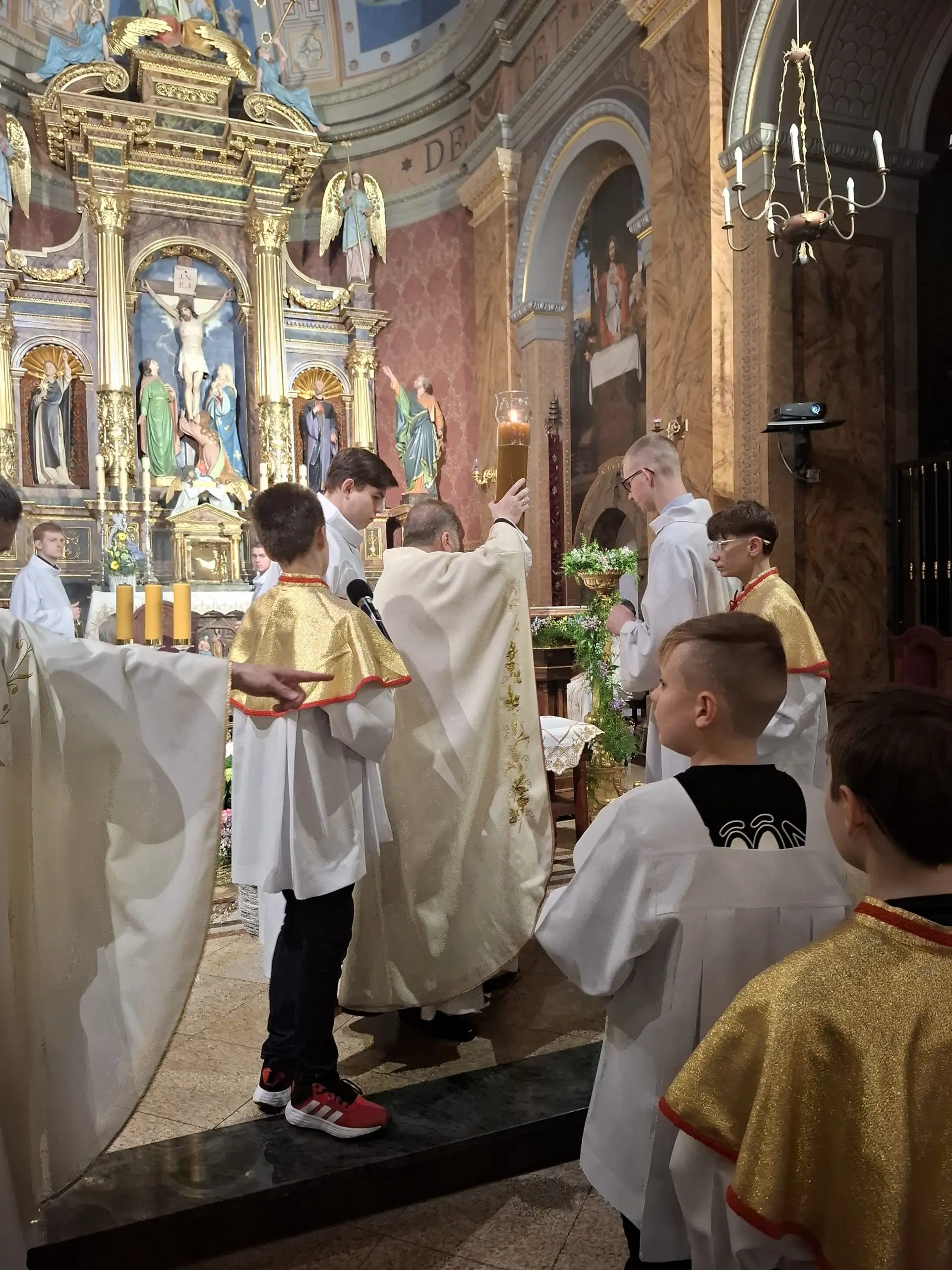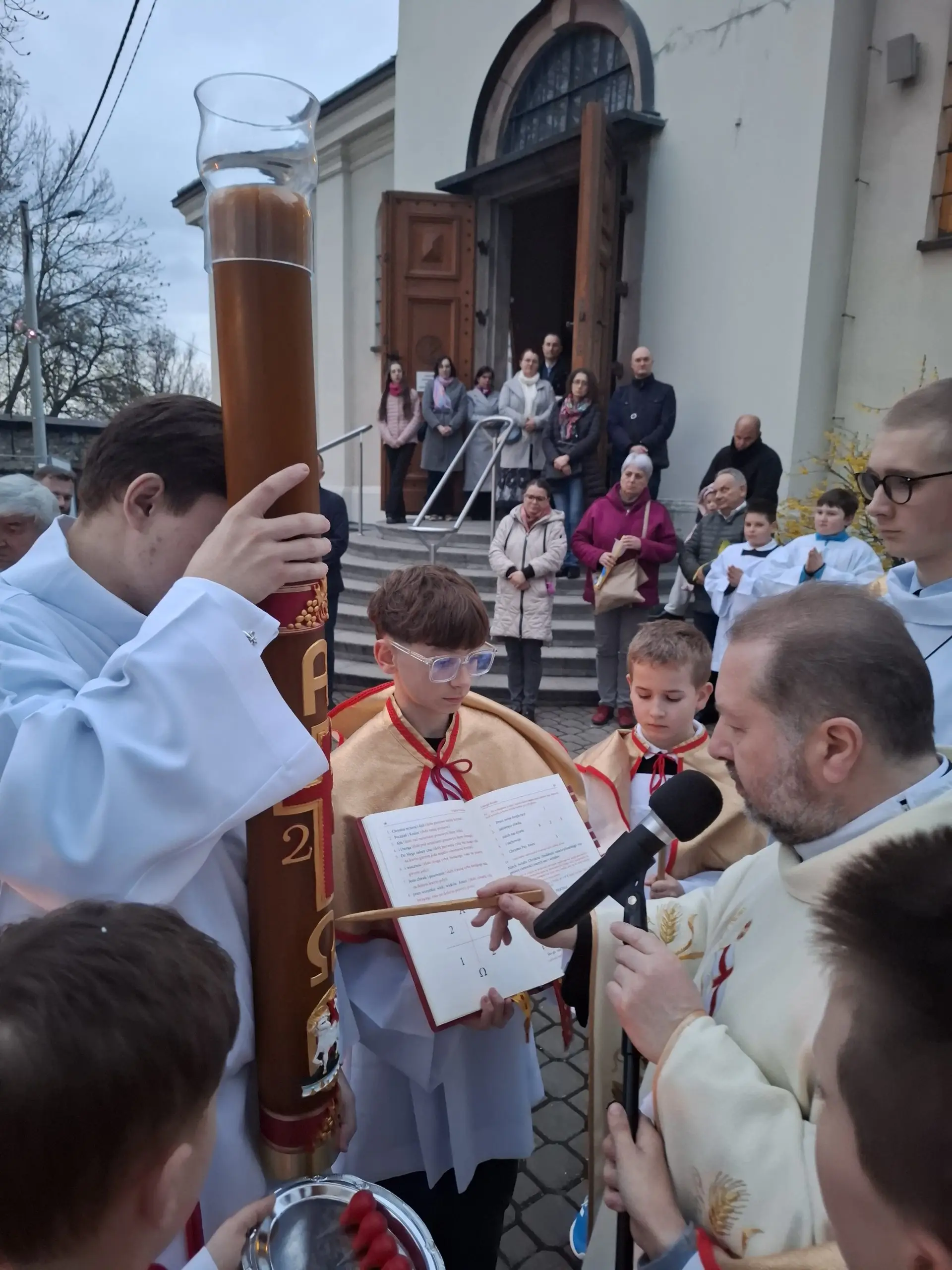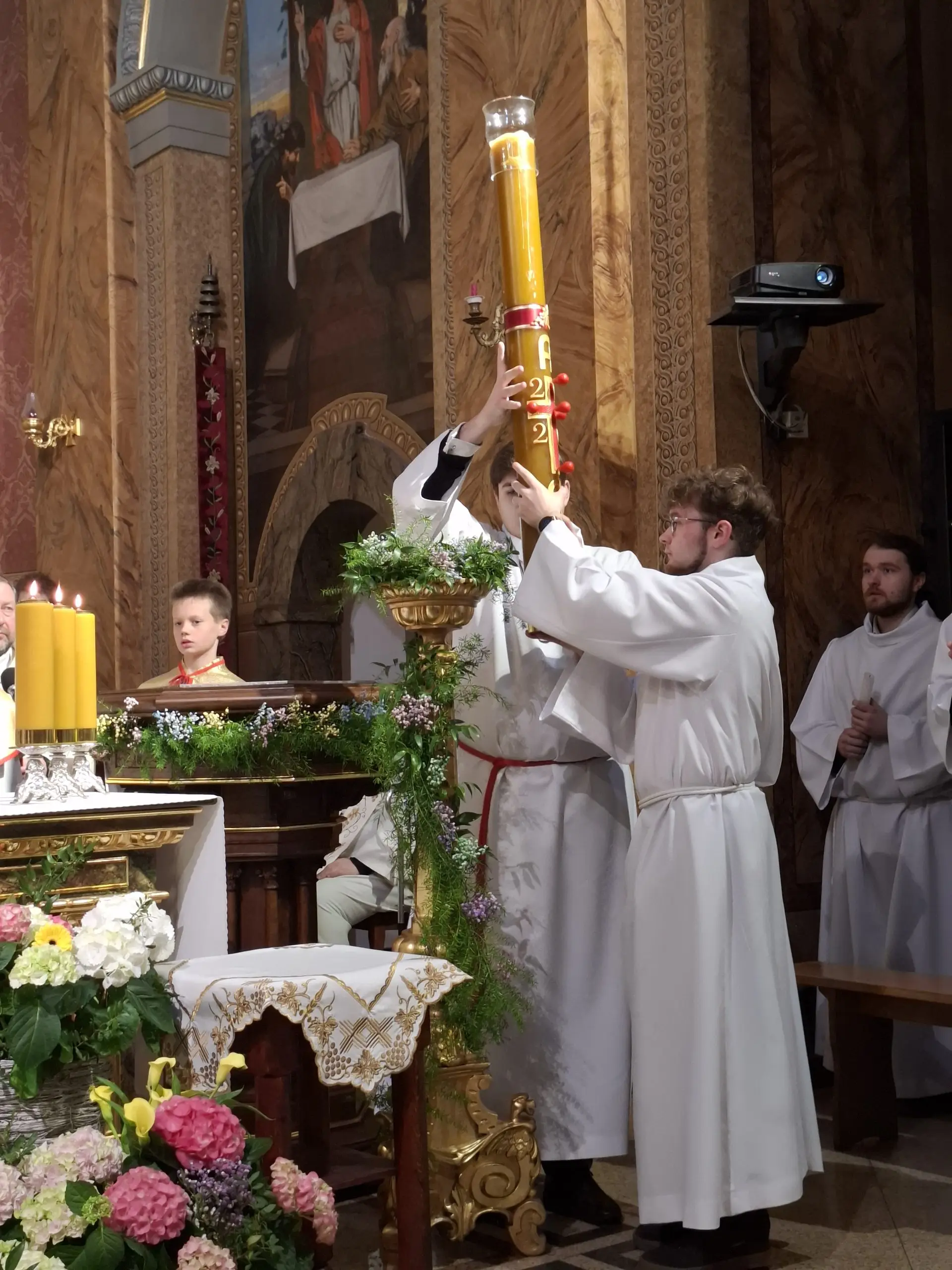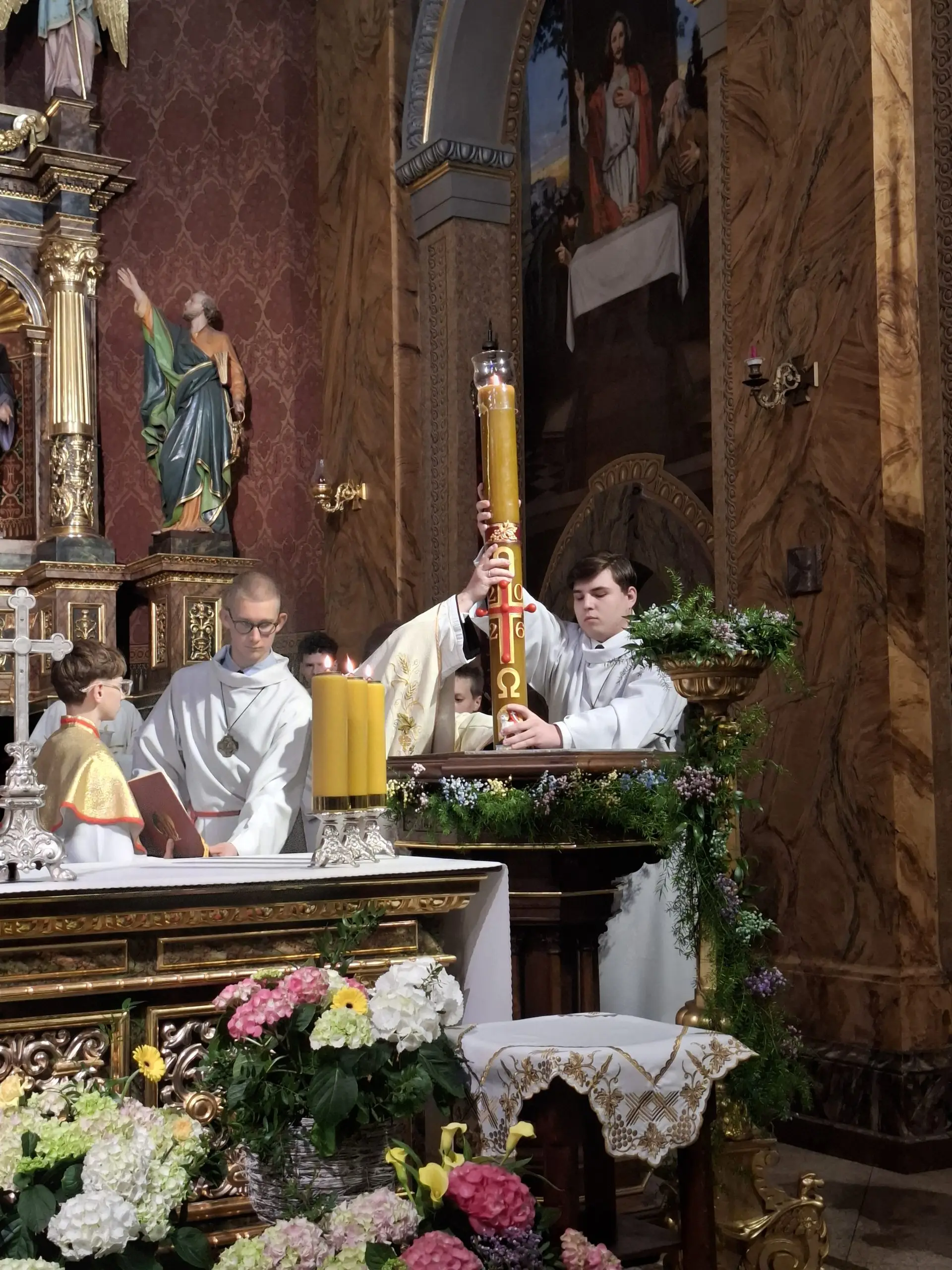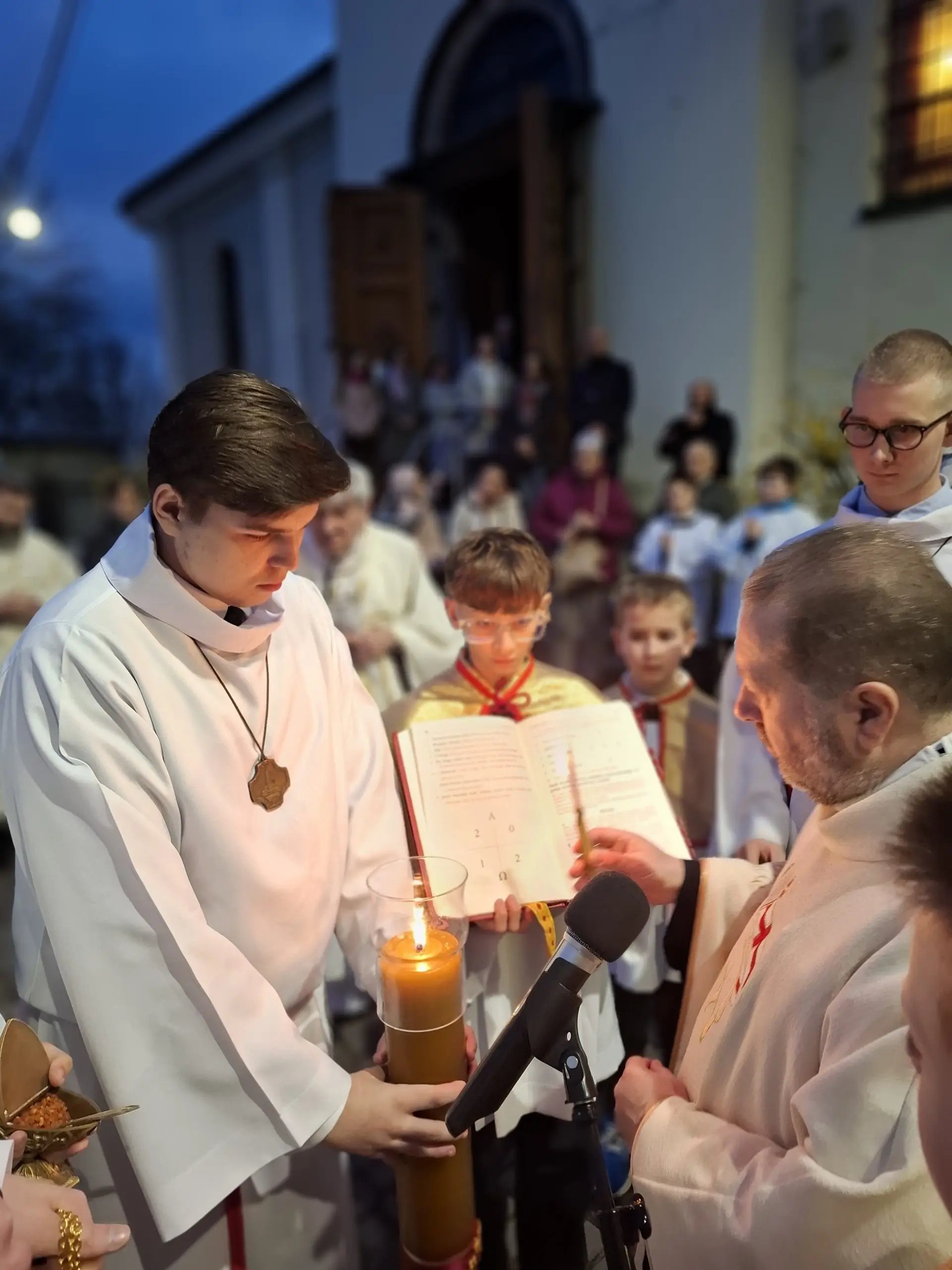Odnawiamy przyrzeczenia chrzcielne. Od ognia rozpalonego i poświęconego przed kościołem, kapłan zapala paschał, na którym zakreślony jest krzyż oraz litery Alfa i Omega i pięć gwoździ, które symbolizują rany Chrystusa i wypowiada słowa, „Chrystus wczoraj i dziś. Początek i koniec. Alfa i Omega. Do Niego należy czas i wieczność. Jemu chwała i panowanie przez wszystkie wieki wieków”. W uroczystej procesji kapłani wnoszą do świątyni Paschał, od którego wierni zapalają przyniesione świece, symbol Zmartwychwstania. Po liturgii słowa następuje obrzęd poświęcenia wody. Podczas poświęcenia wody celebrans zanurza paschał w święconej wodzie i prosi Boga, aby przez Swojego Syna zesłał na tę wodę moc Ducha Świętego. Zanurzenie to symbolizuje prawdę, iż chrzest jest sakramentem współumierania i współzmartwychwstania z Chrystusem. Z zapalonymi świecami w ręku, wierni wyrzekają się grzechu, wszystkiego, co prowadzi do zła i szatana, głównego sprawcy grzechu, a następnie wyznają wiarę w Ojca, Syna i Ducha Świętego. Na zakończenie uroczystości w sobotni wieczór wokół kościoła wyruszyła procesja z Najświętszym Sakramentem wyniesionym z grobu, dla podkreślenia tajemnicy, że ten sam zmartwychwstały Chrystus jest obecny pod postaciami eucharystycznymi, wśród bicia dzwonów rozbrzmiewało głośne Alleluja! Pan Zmartwychwstał Alleluja. Figura zmartwychwstałego Chrystusa z chorągwią w ręce – niesiona przez ministrantów przypomina zwycięstwo odniesione nad śmiercią i chwałę, a krzyż niesiony z czerwoną stułą – symbol Chrystusa Kapłana.