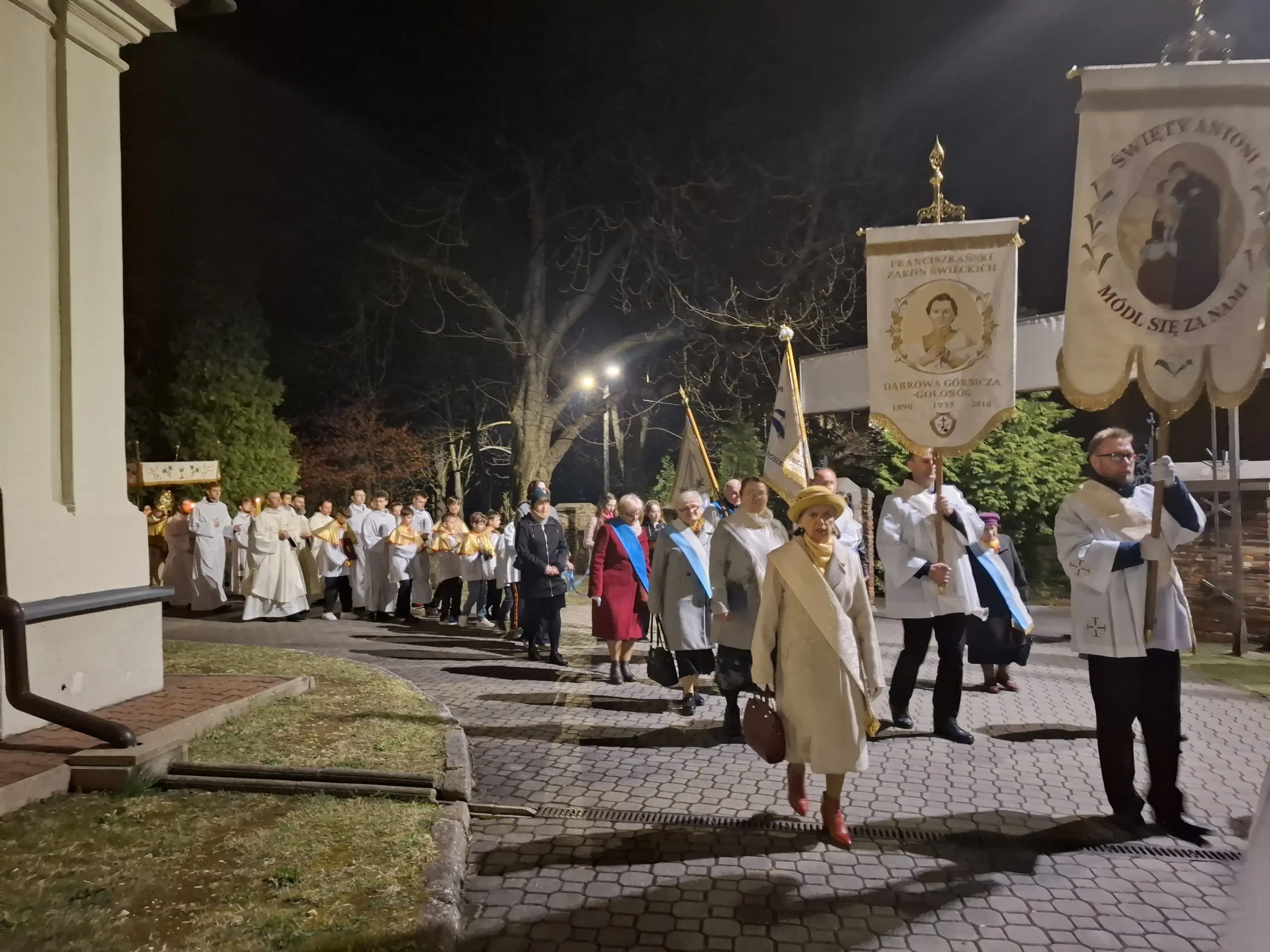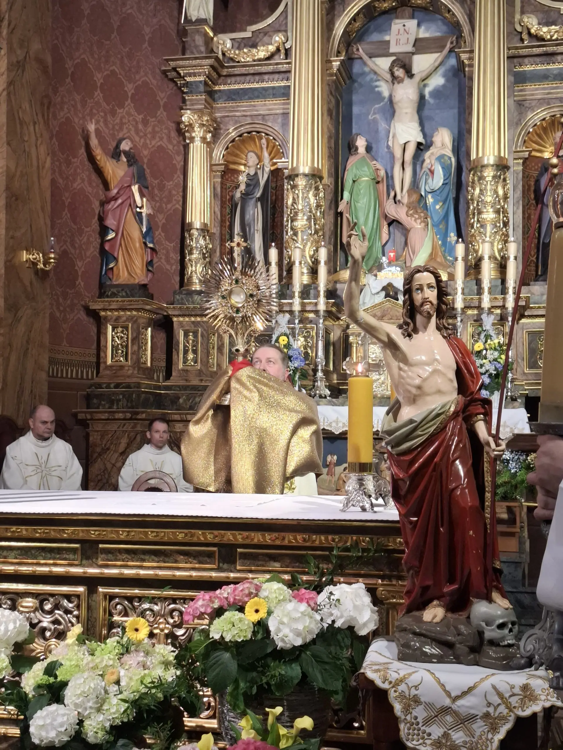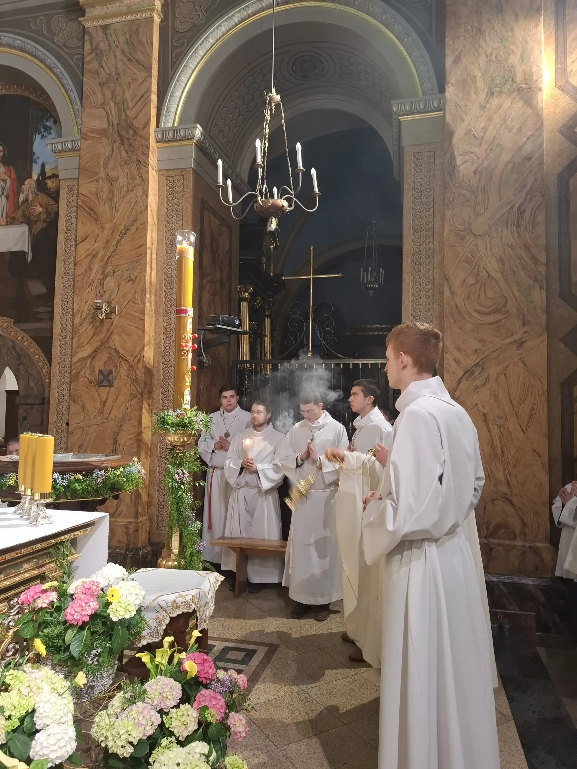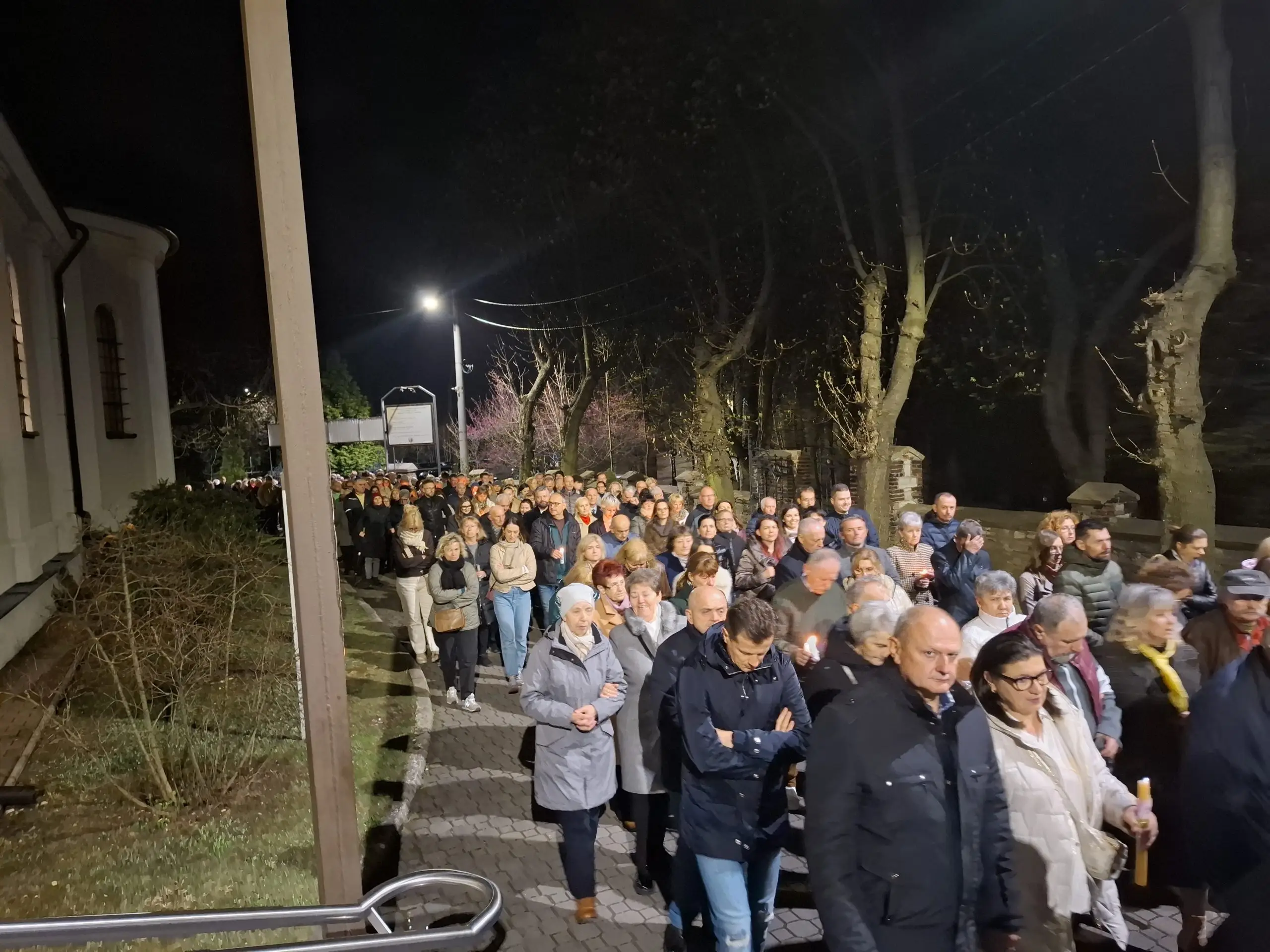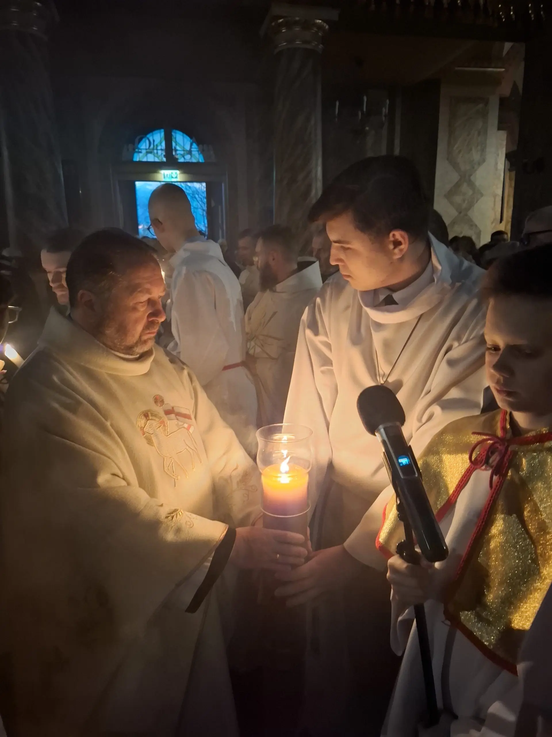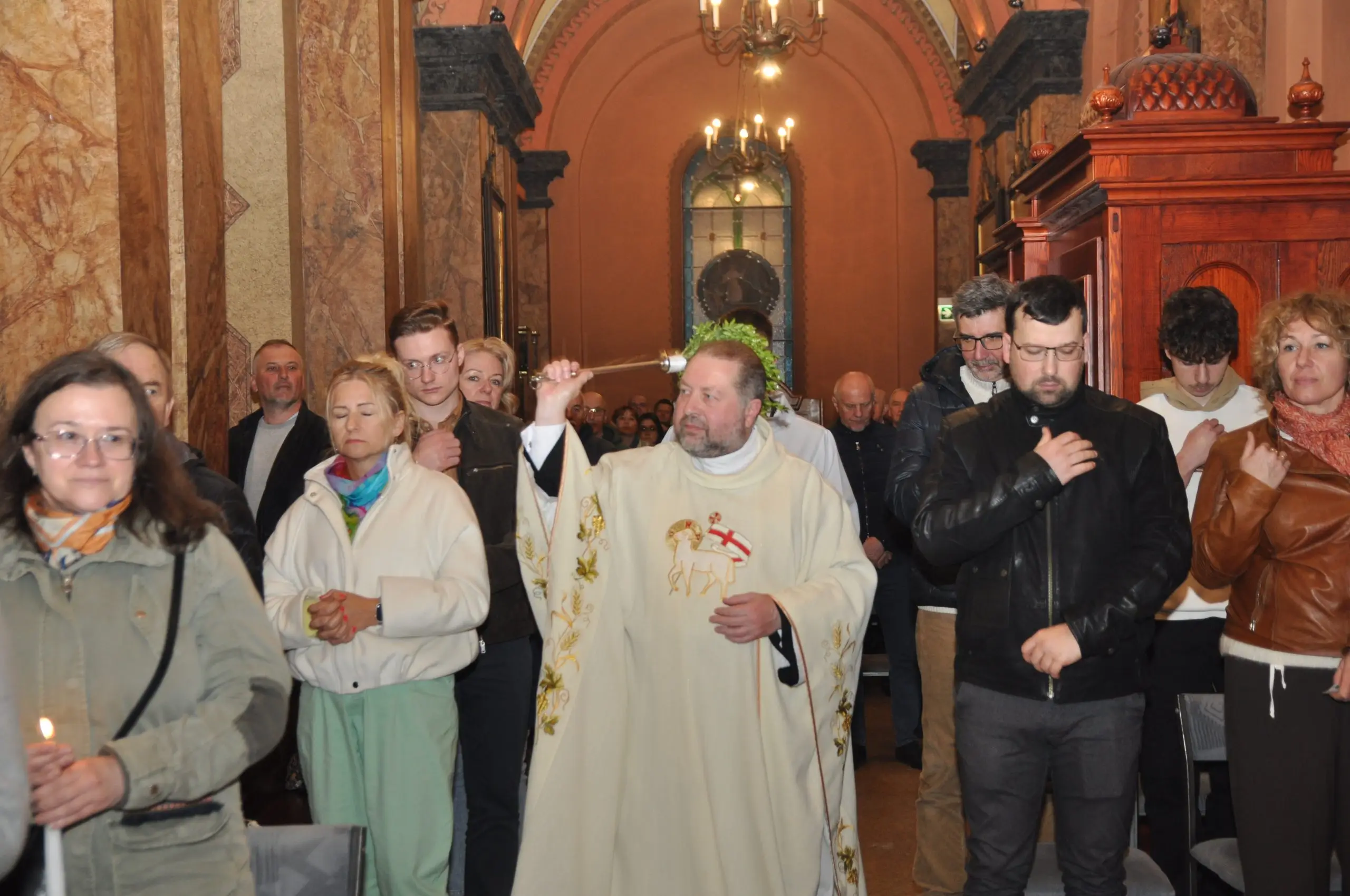 Odnawiamy przyrzeczenia chrzcielne. Od ognia rozpalonego i poświęconego przed kościołem, kapłan zapala paschał, na którym zakreślony jest krzyż oraz litery Alfa i Omega i pięć gwoździ, które symbolizują rany Chrystusa i wypowiada słowa, „Chrystus wczoraj i dziś. Początek i koniec. Alfa i Omega. Do Niego należy czas i wieczność. Jemu chwała i panowanie przez wszystkie wieki wieków”. W uroczystej procesji kapłani wnoszą do świątyni Paschał, od którego wierni zapalają przyniesione świece, symbol Zmartwychwstania. Po liturgii słowa następuje obrzęd poświęcenia wody. Podczas poświęcenia wody celebrans zanurza paschał w święconej wodzie i prosi Boga, aby przez Swojego Syna zesłał na tę wodę moc Ducha Świętego. Zanurzenie to symbolizuje prawdę, iż chrzest jest sakramentem współumierania i współzmartwychwstania z Chrystusem. Z zapalonymi świecami w ręku, wierni wyrzekają się grzechu, wszystkiego, co prowadzi do zła i szatana, głównego sprawcy grzechu, a następnie wyznają wiarę w Ojca, Syna i Ducha Świętego. Na zakończenie uroczystości w sobotni wieczór wokół kościoła wyruszyła procesja z Najświętszym Sakramentem wyniesionym z grobu, dla podkreślenia tajemnicy, że ten sam zmartwychwstały Chrystus jest obecny pod postaciami eucharystycznymi, wśród bicia dzwonów rozbrzmiewało głośne Alleluja! Pan Zmartwychwstał Alleluja. Figura zmartwychwstałego Chrystusa z chorągwią w ręce – niesiona przez ministrantów przypomina zwycięstwo odniesione nad śmiercią i chwałę, a krzyż niesiony z czerwoną stułą – symbol Chrystusa Kapłana.