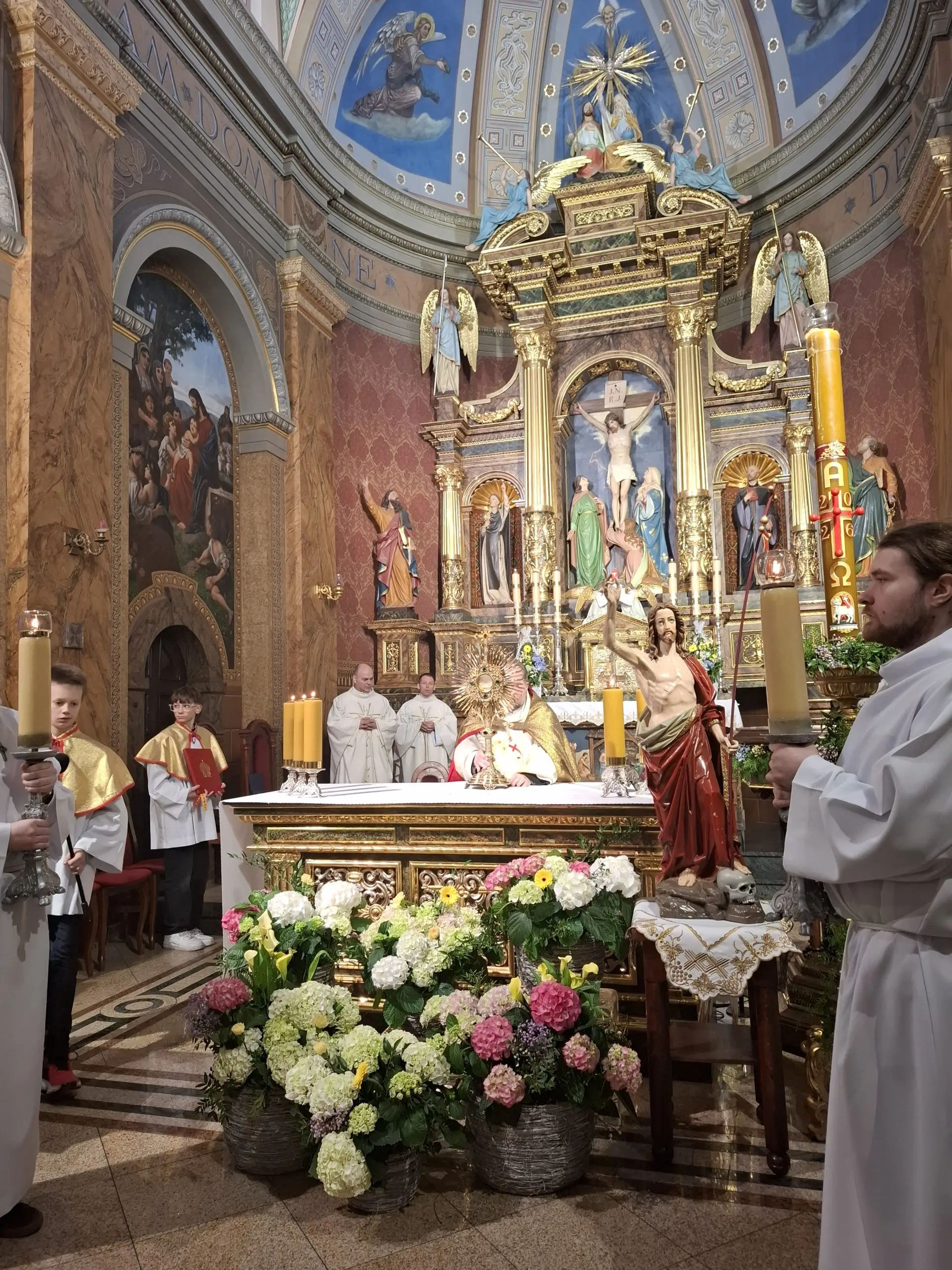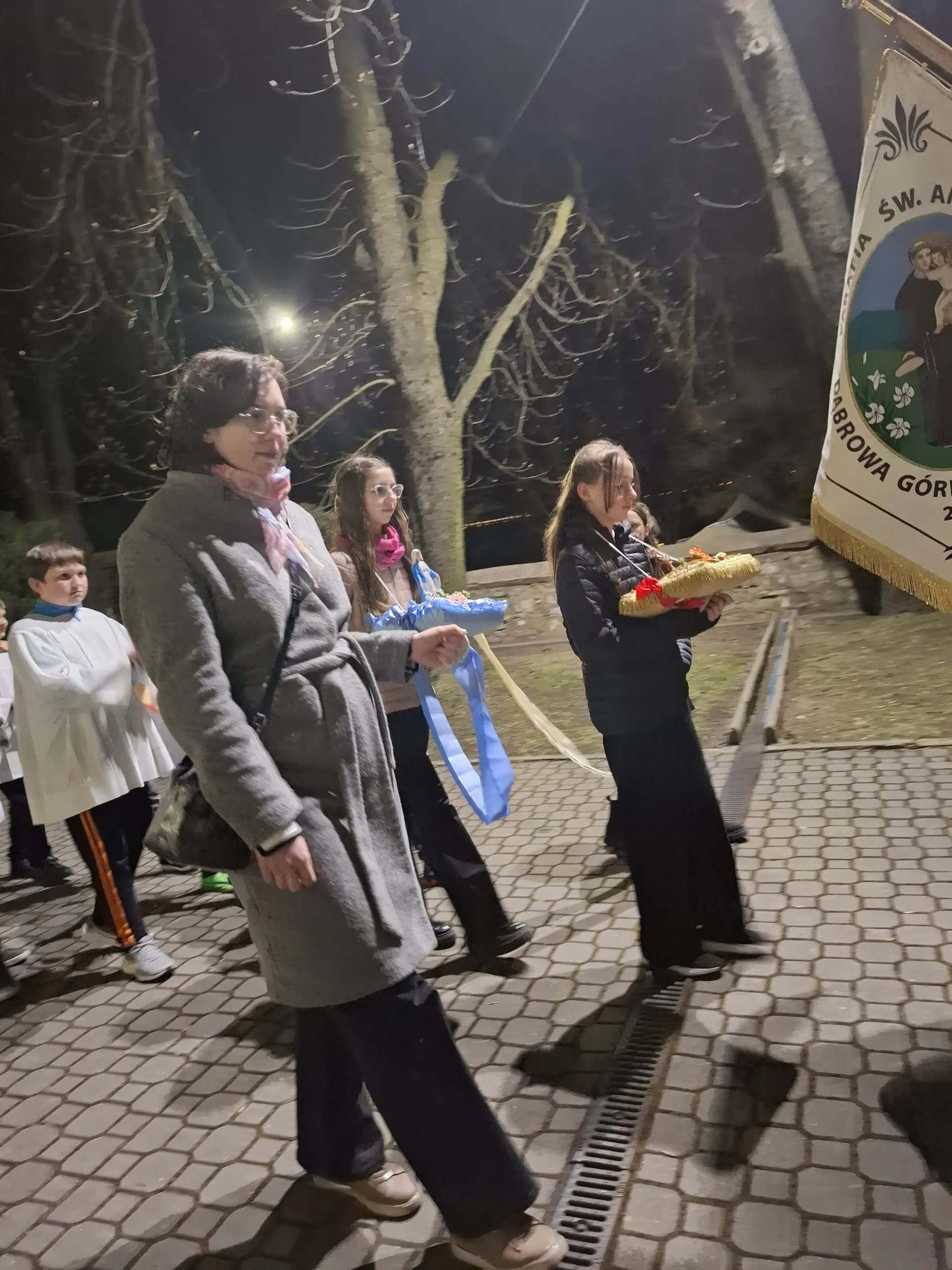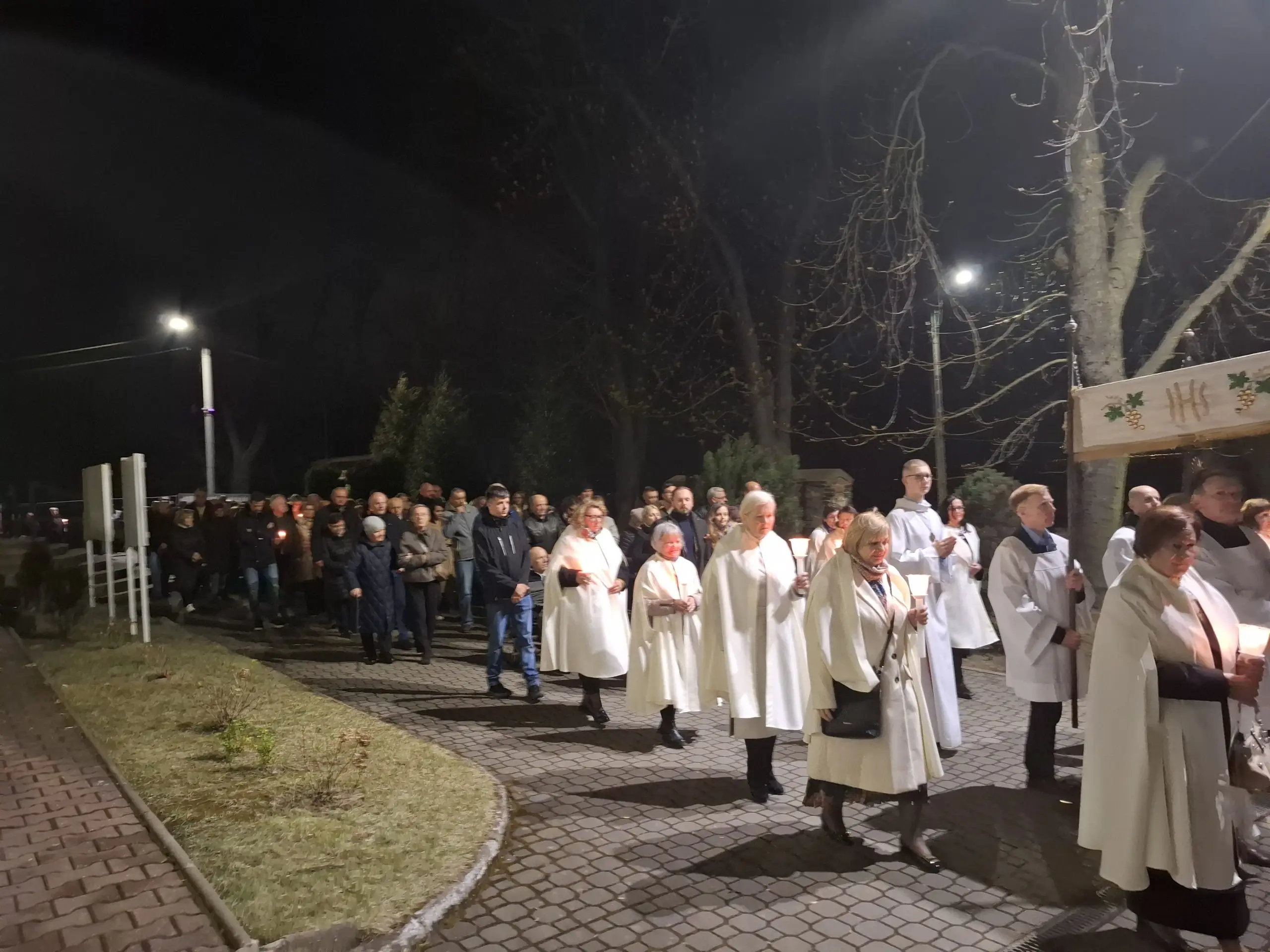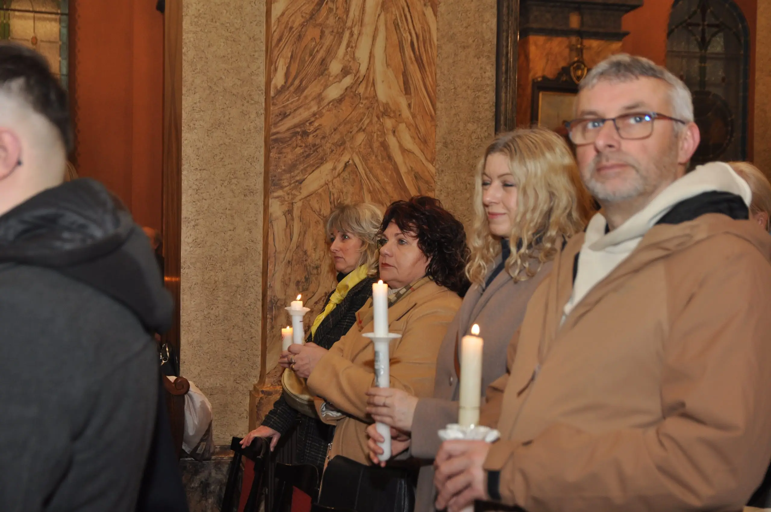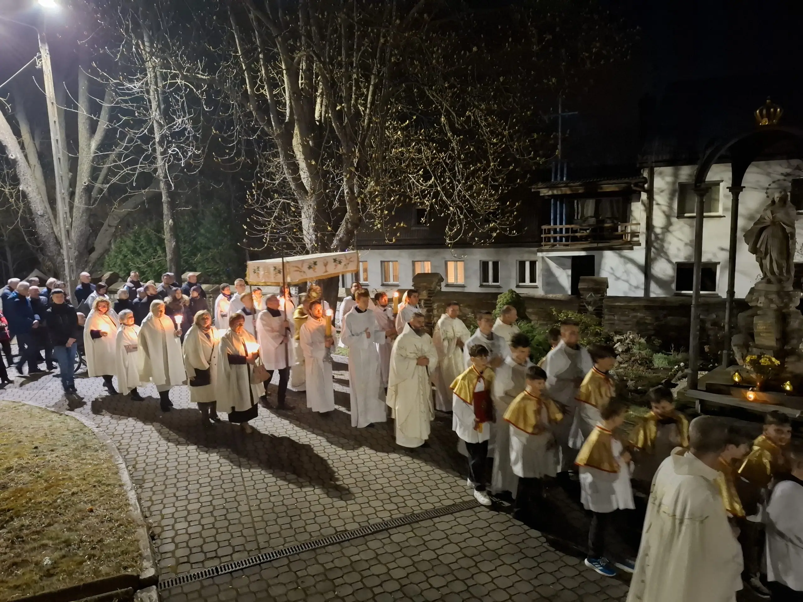 Odnawiamy przyrzeczenia chrzcielne. Od ognia rozpalonego i poświęconego przed kościołem, kapłan zapala paschał, na którym zakreślony jest krzyż oraz litery Alfa i Omega i pięć gwoździ, które symbolizują rany Chrystusa i wypowiada słowa, „Chrystus wczoraj i dziś. Początek i koniec. Alfa i Omega. Do Niego należy czas i wieczność. Jemu chwała i panowanie przez wszystkie wieki wieków”. W uroczystej procesji kapłani wnoszą do świątyni Paschał, od którego wierni zapalają przyniesione świece, symbol Zmartwychwstania. Po liturgii słowa następuje obrzęd poświęcenia wody. Podczas poświęcenia wody celebrans zanurza paschał w święconej wodzie i prosi Boga, aby przez Swojego Syna zesłał na tę wodę moc Ducha Świętego. Zanurzenie to symbolizuje prawdę, iż chrzest jest sakramentem współumierania i współzmartwychwstania z Chrystusem. Z zapalonymi świecami w ręku, wierni wyrzekają się grzechu, wszystkiego, co prowadzi do zła i szatana, głównego sprawcy grzechu, a następnie wyznają wiarę w Ojca, Syna i Ducha Świętego. Na zakończenie uroczystości w sobotni wieczór wokół kościoła wyruszyła procesja z Najświętszym Sakramentem wyniesionym z grobu, dla podkreślenia tajemnicy, że ten sam zmartwychwstały Chrystus jest obecny pod postaciami eucharystycznymi, wśród bicia dzwonów rozbrzmiewało głośne Alleluja! Pan Zmartwychwstał Alleluja. Figura zmartwychwstałego Chrystusa z chorągwią w ręce – niesiona przez ministrantów przypomina zwycięstwo odniesione nad śmiercią i chwałę, a krzyż niesiony z czerwoną stułą – symbol Chrystusa Kapłana.