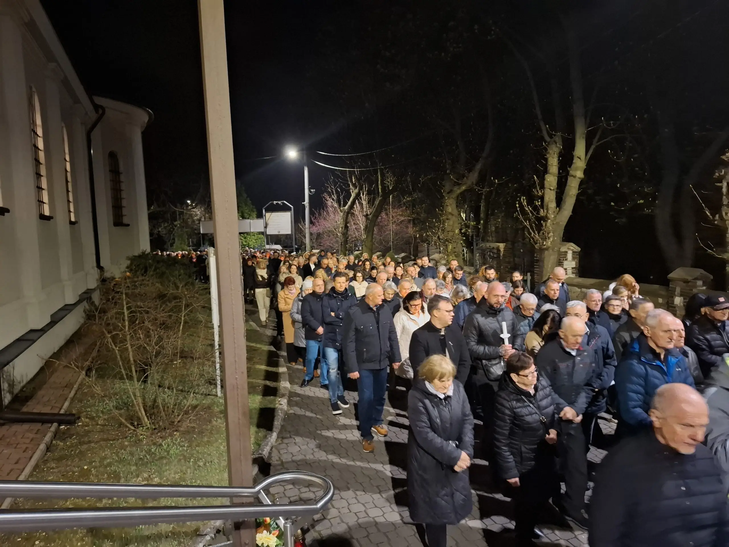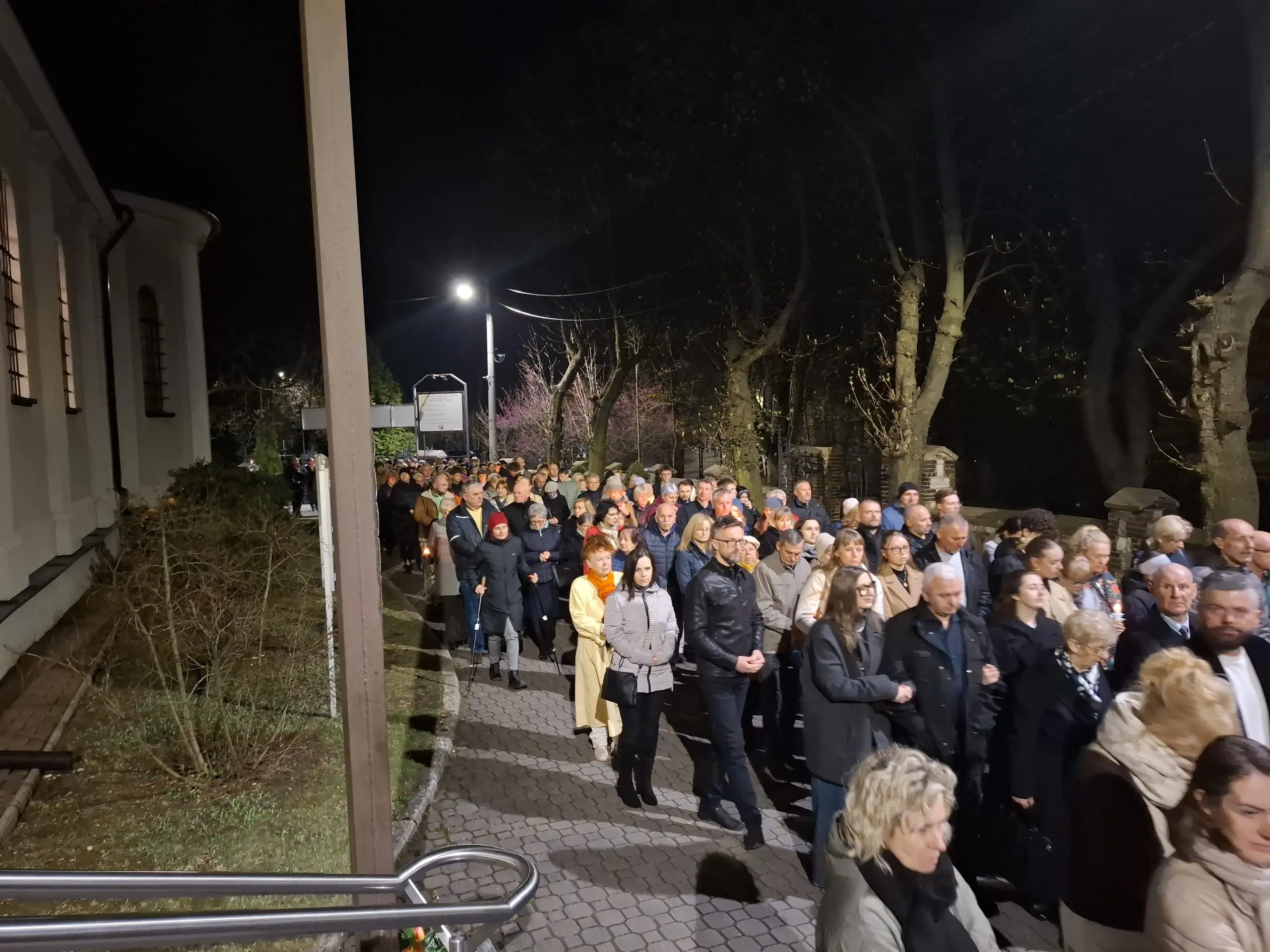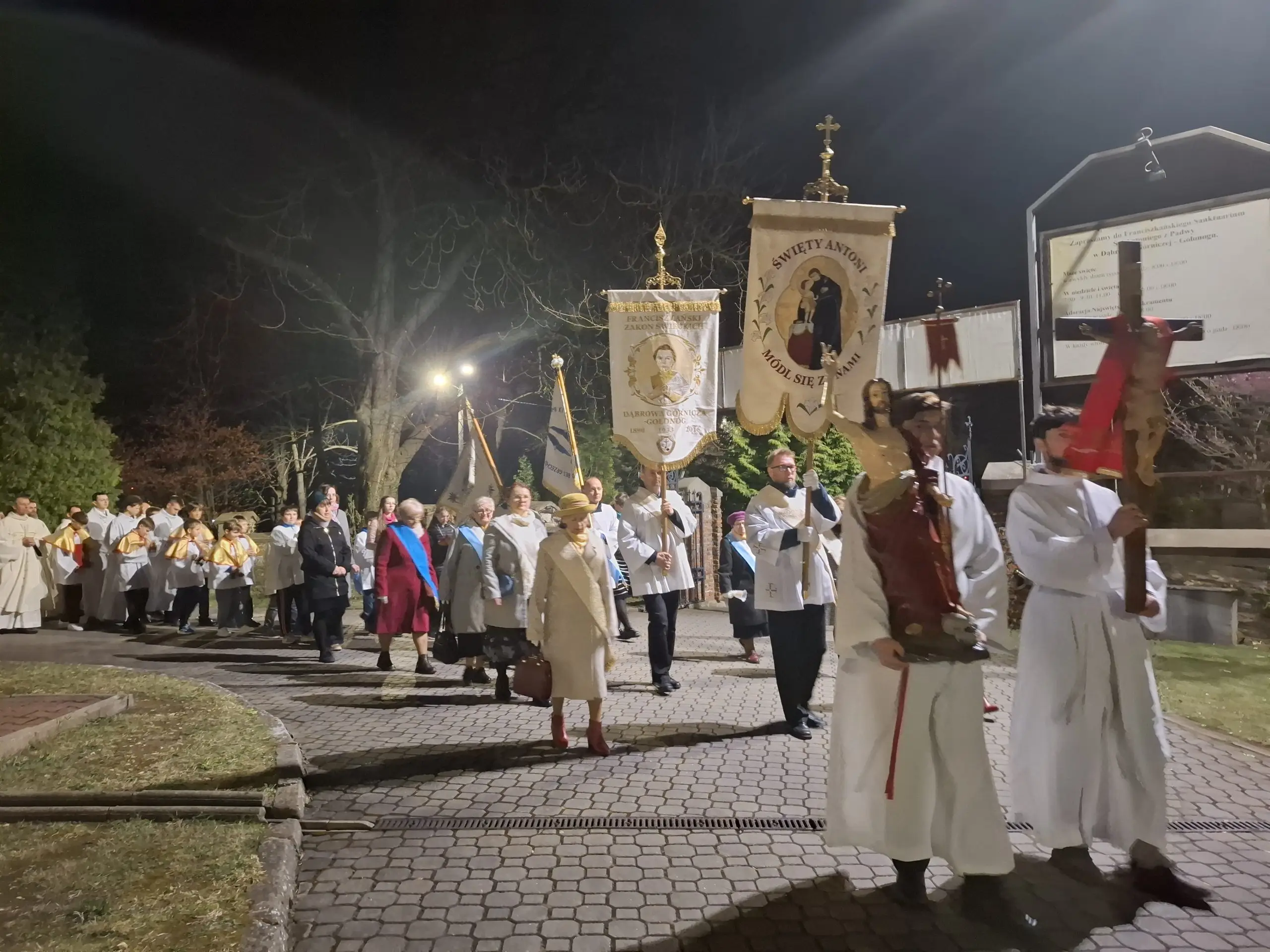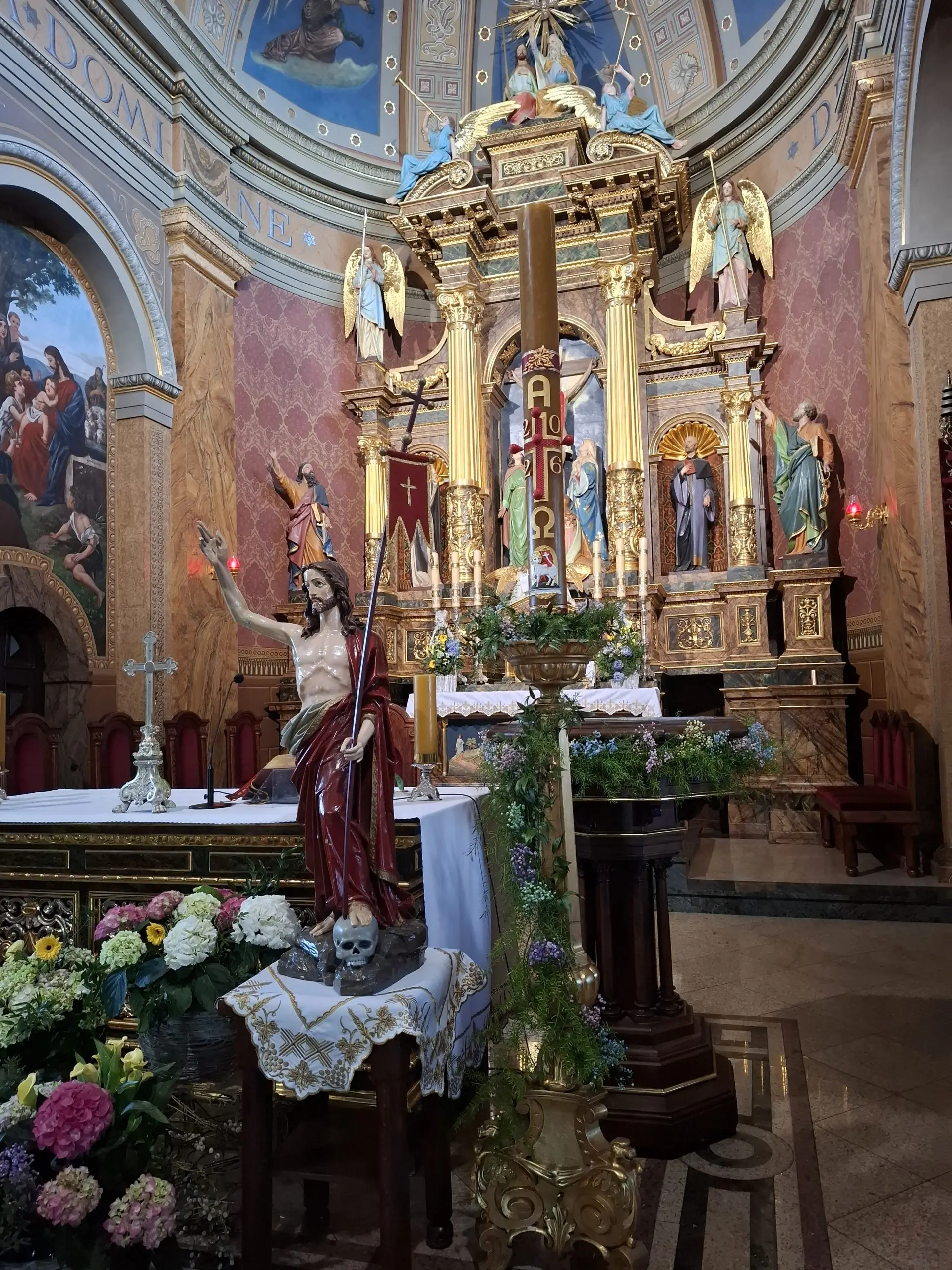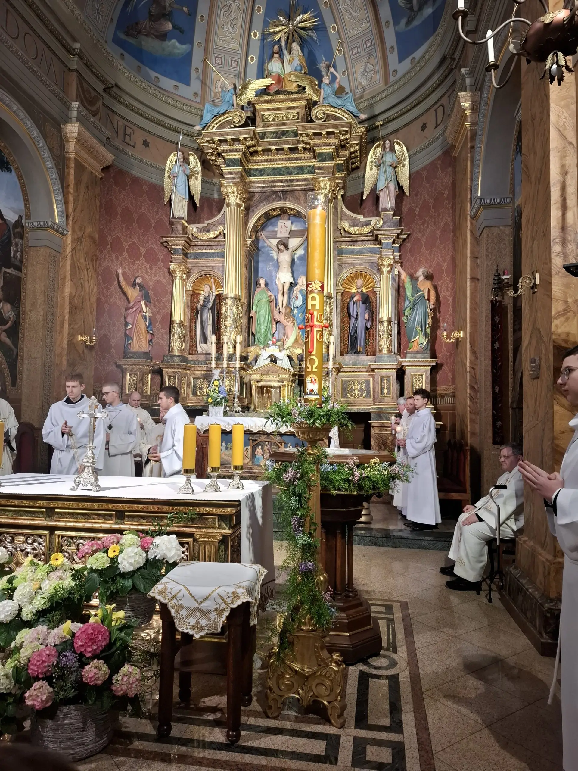 Odnawiamy przyrzeczenia chrzcielne. Od ognia rozpalonego i poświęconego przed kościołem, kapłan zapala paschał, na którym zakreślony jest krzyż oraz litery Alfa i Omega i pięć gwoździ, które symbolizują rany Chrystusa i wypowiada słowa, „Chrystus wczoraj i dziś. Początek i koniec. Alfa i Omega. Do Niego należy czas i wieczność. Jemu chwała i panowanie przez wszystkie wieki wieków”. W uroczystej procesji kapłani wnoszą do świątyni Paschał, od którego wierni zapalają przyniesione świece, symbol Zmartwychwstania. Po liturgii słowa następuje obrzęd poświęcenia wody. Podczas poświęcenia wody celebrans zanurza paschał w święconej wodzie i prosi Boga, aby przez Swojego Syna zesłał na tę wodę moc Ducha Świętego. Zanurzenie to symbolizuje prawdę, iż chrzest jest sakramentem współumierania i współzmartwychwstania z Chrystusem. Z zapalonymi świecami w ręku, wierni wyrzekają się grzechu, wszystkiego, co prowadzi do zła i szatana, głównego sprawcy grzechu, a następnie wyznają wiarę w Ojca, Syna i Ducha Świętego. Na zakończenie uroczystości w sobotni wieczór wokół kościoła wyruszyła procesja z Najświętszym Sakramentem wyniesionym z grobu, dla podkreślenia tajemnicy, że ten sam zmartwychwstały Chrystus jest obecny pod postaciami eucharystycznymi, wśród bicia dzwonów rozbrzmiewało głośne Alleluja! Pan Zmartwychwstał Alleluja. Figura zmartwychwstałego Chrystusa z chorągwią w ręce – niesiona przez ministrantów przypomina zwycięstwo odniesione nad śmiercią i chwałę, a krzyż niesiony z czerwoną stułą – symbol Chrystusa Kapłana.