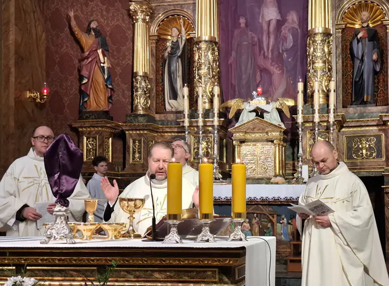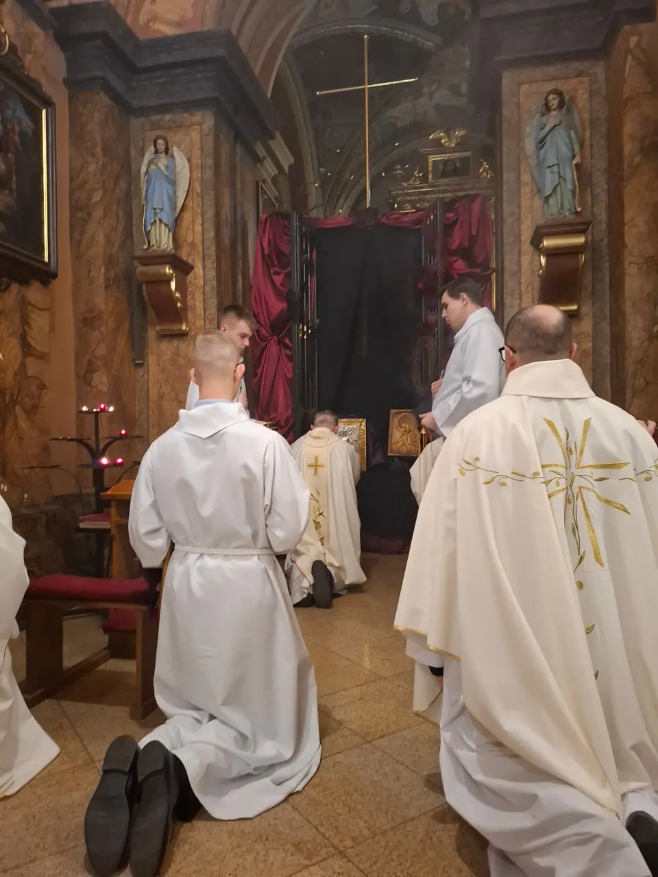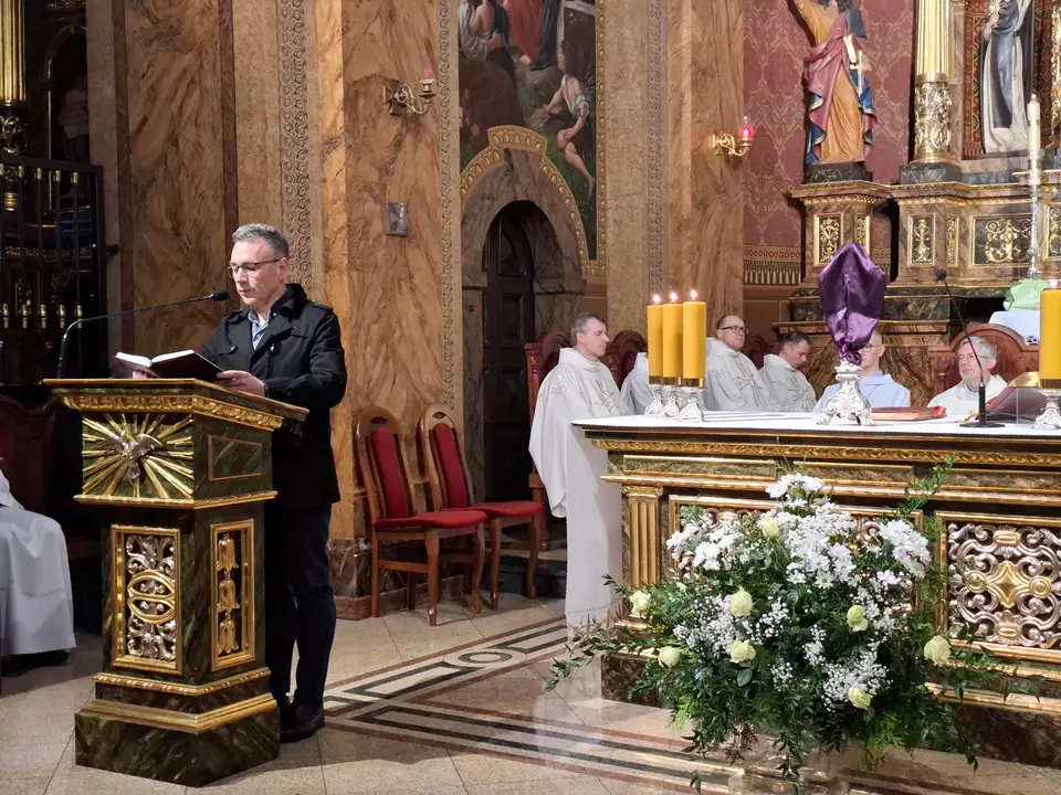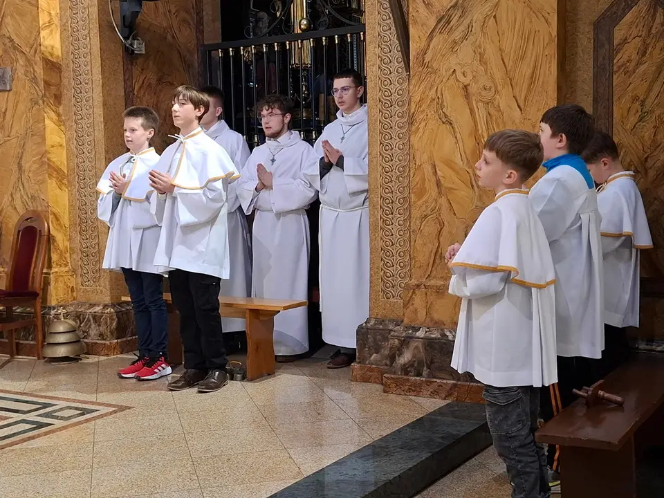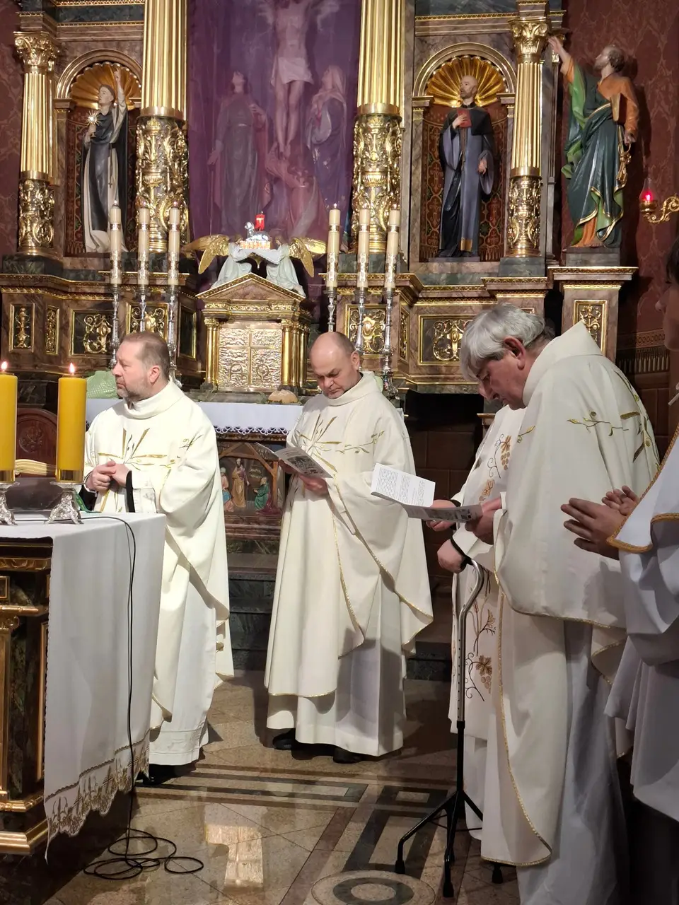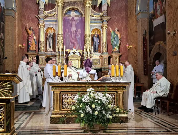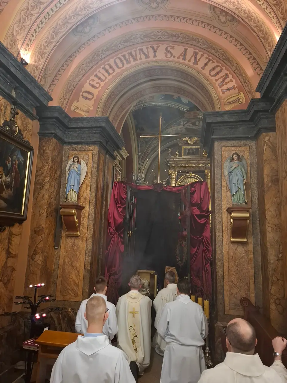 Uroczystej Eucharystii Wielkiego Czwartku przewodniczył i okolicznościowe słowo Boże wygłosił Prowincjał o. Mariusz Kozioł przełożony Zakonu Braci Mniejszych Konwentualnych w Krakowie w koncelebrze z o. Jan Maria Szewek OFMConv sekretarzem prowincjała, proboszczem naszej parafii o. Pawłem w wraz ze współbraćmi w kapłaństwie. Przedstawiciele wspólnot działających w parafii złożyli kwiaty na ręce Prowincjała o. Mariusza jako podziękowanie dla wszystkich kapłanów za ich posługę posłania w w Bożym powołaniu. Po zakończeniu Eucharystii, Najświętszy Sakrament został procesyjnie przeniesiony do Ciemnicy. Jest to moment przypominający nam wydarzenia, które nastąpiły po Ostatniej Wieczerzy: pojmania Jezusa, sądu u Annasza i Kajfasza, zaparcie się Piotra oraz nocnego czuwania w Ogrójcu.